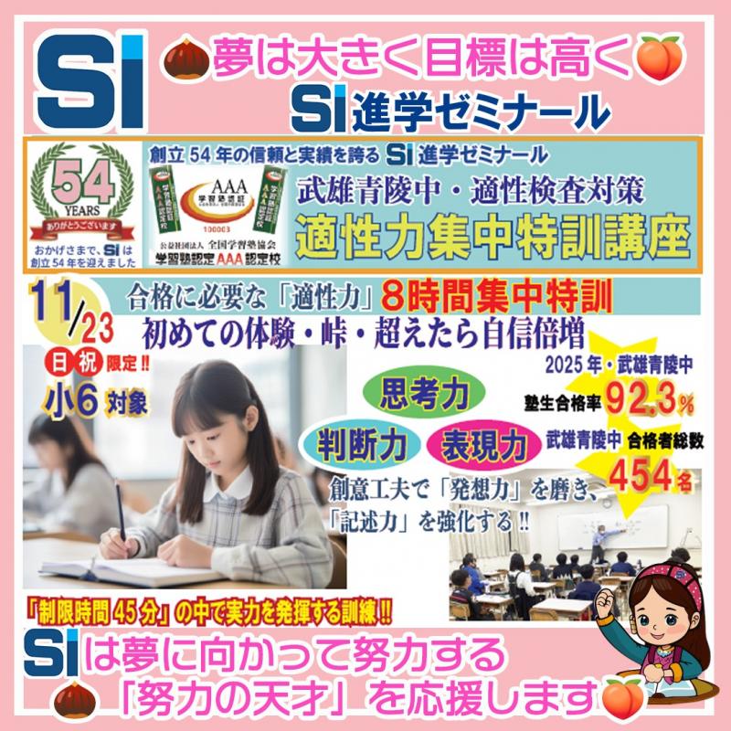 2025年度、SIでは生徒の皆さんの頑張りで17名の青陵合格者を輩出することができました✨内、短期講座生を除く、塾生は13名が合格です✨今年もより多くの塾生を合格に導くため、「SI適性合格3本の矢」2本目の矢として、11月23日(日)・(祝)、『SI適性力集中特訓講座』を開催✨SIの過去問研究で完成した演習&解説で、武雄青陵中合格へ一直線✨8時間集中特訓は、皆さん、初めての体験になりますが、一旦峠を越えたら、大きな自信を手に入れることができますよ✨さあ、『12歳の挑戦』、共に駆け抜けていきましょう✨申込締切は、10月25日(土)です✨SI塾生・入塾生、優先受付となります✨